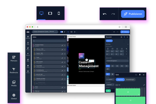 С Raccoon съчетаваме най-доброто от два свята: Гъвкавост и структура. Тук няма място за хаос - вместо това нашето решение позволява ясно и интуитивно управление на съдържанието на вашия уебсайт, без да ограничава творческата Ви свобода.